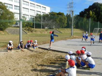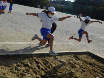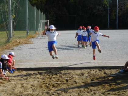 体育です。幅跳びの練習です。砂場に用意されたゴム紐を目安にして、自分の目標の距離に向かってジャンプです。