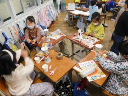 11/11(木) 1年生 公開日 2021/11/11 更新日 2021/11/11 1年生 生活科です。「秋フェスティバル」の準備です。みんなで遊ぶための道具や看板などをグループで協力して作っています。