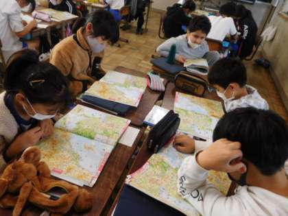社会です。地名しりとりをグループで作っています。小さな積み重ねで地図にも慣れ、たくさんの地名に触れることができています。