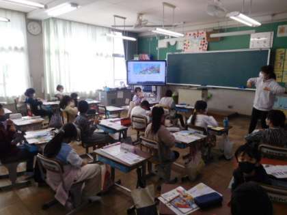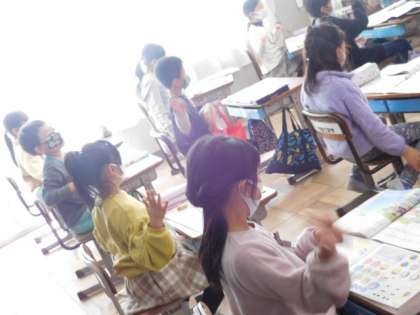 音楽です。「ジェットコースター」という曲を身振り手振りを使って表現しながら歌っています。ジェットコースターに乗っている気持ちがあらわせたかな。