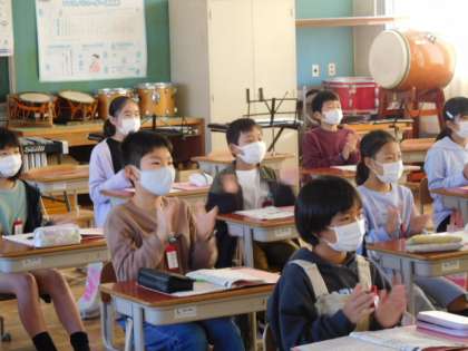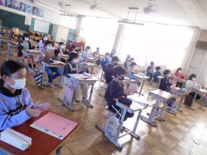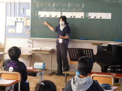 11/15(月) 4年生 公開日 2021/11/15 更新日 2021/11/15 4年生 音楽です。リピート記号や「♩タン」「♩.♪タッカ」のリズムを手拍子で確認練習しています。何度も繰り返し練習してタイミングを合わせていきます。