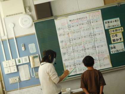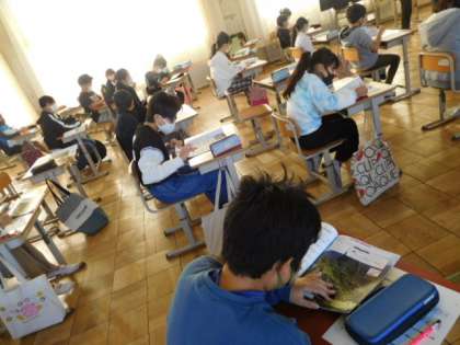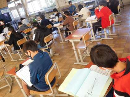 音楽です。「風とケーナのロマンス」の歌のテストを行っています。感染対策のためみんなとは逆の方向を向いて行っています。順番を待つ間、復習問題に取り組んでいますが、緊張気味ですね。