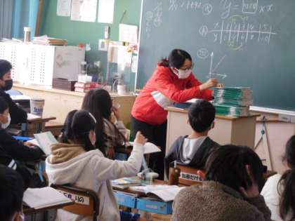算数です。「比例」を学習しています。y=□xの公式を使って、積み上げたノートの高さと、1冊のノートの厚さから、何冊あるか求めています。この作業を通して関数のよさが分かるといいですね。