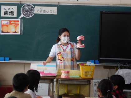 11/17(水) 3年生 公開日 2021/11/17 更新日 2021/11/17 3年生 3年生が、歯科衛生士さんによる「歯磨き指導」を受けています。乳歯と永久歯で歯の磨き方を変えないと歯垢が残ってしまうというお話に真剣に耳を傾けています。