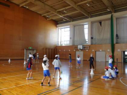 体育です。「プレルボール」の学習です。試合するチームと審判するチームをローテーションして総当たり戦で練習試合をしています。チームワークの磨かれる競技です。