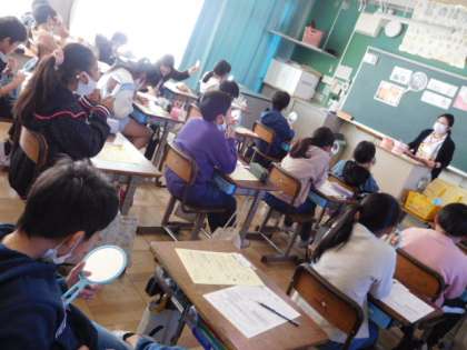11/17(水) 4年生 公開日 2021/11/17 更新日 2021/11/17 4年生 4年生も歯科衛生士さんによる「歯磨き指導」をしていただきました。小臼歯(前から4,5番目の歯)が生え替わるときにかむ力が弱くなることや歯垢がつきやすい場所だと言うことを教えていただきました。鏡を見て確認しています。