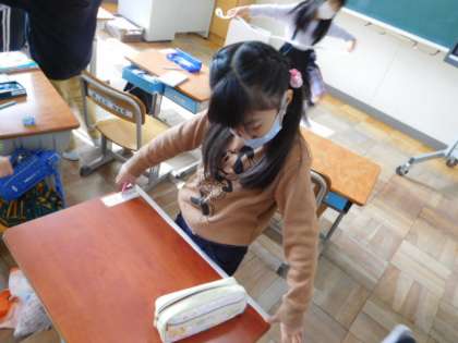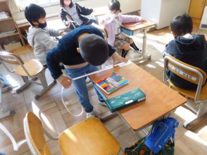 12/1(水) 1年生 公開日 2021/12/01 更新日 2021/12/01 1年生 算数です。「ながさくらべ」の学習です。リボンを使って、机の縦と横の長さの違いを測っています。紅葉差体験をして長さの概念を身につけていきます。