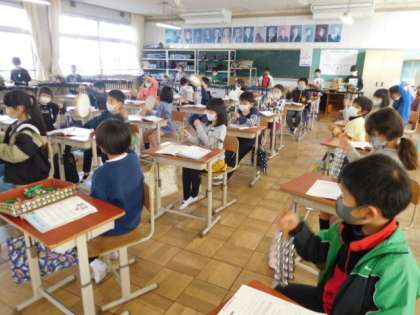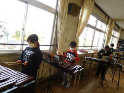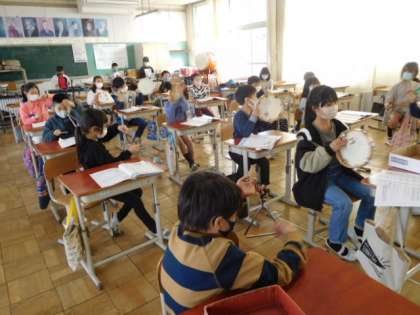 12/1(火) 3年生 公開日 2021/12/01 更新日 2021/12/01 3年生 音楽です。「雪のおどり」という曲を、トライアングル、タンブリン、すず、スレイベル、鉄琴、木琴を交替して使いながら演奏しています。それぞれの楽器のよさを生かして演奏できています。