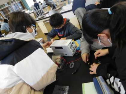 12/7(火) 5年生 公開日 2021/12/07 更新日 2021/12/07 5年生 理科です。電磁石の磁力を強くするにはどうしたらいいか、実験を行っています。コイルの巻き数を変えたり、電流の強さを変えたりし、条件を変えて電磁石の強さを確かめています。どんな結論が導き出せるでしょうか。