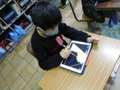 12/7(火) 2年生 公開日 2021/12/07 更新日 2021/12/07 2年生 図工です。「光のプレゼント」の製作が始まります。買ったナイフで形をくりぬいた画用紙に、裏からセロハン紙を貼って光を通します。下描きをロイロノートで作成しています。先生に提出すると、アドバイス付きで返却していただけます。
