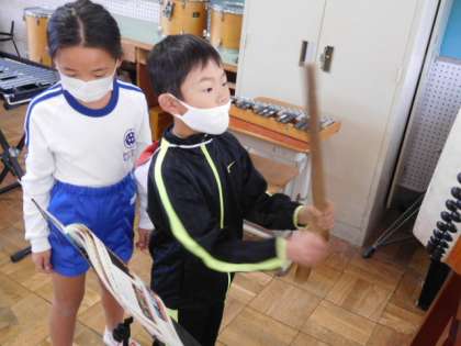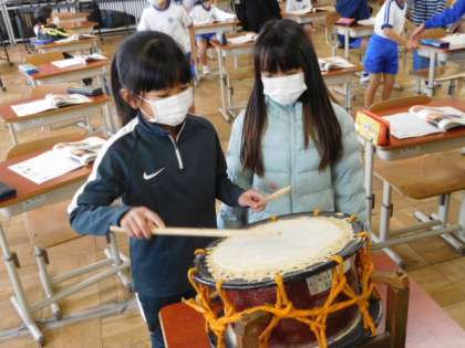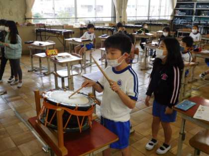 12/8(水) 2年生 公開日 2021/12/08 更新日 2021/12/08 2年生 音楽です。「村まつり」の練習です。演奏に使う太鼓の練習もしています。「♩♫♩♩」や「♫♫♫♩」などのリズムを太鼓で上手に奏でています。