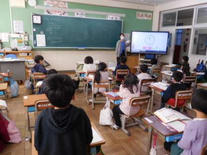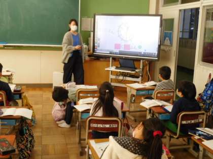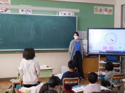 算数です。これまで習ったことをもう一度振り返って身についているか確認しています。時計の読み方はしっかり身についているようです。