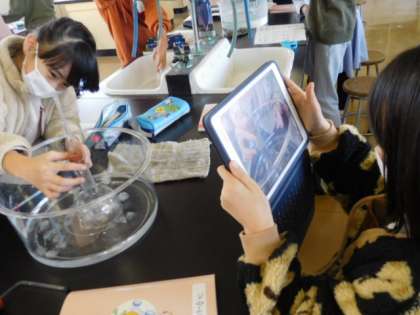 理科です。閉じ込めた空気を温めたり冷やしたりして、体積が変わるかどうかを調べています。変化の様子をタブレット端末で撮影し、みんなで確かめます。