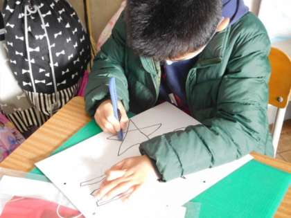 12/17(金) 2年生 公開日 2021/12/17 更新日 2021/12/17 2年生 図工です。「ひかりのプレゼント」の製作です。下描きの線をカッターナイフで切り抜き、セロハンの大きさを合わせながら、熱心に製作に打ち込んでいます。