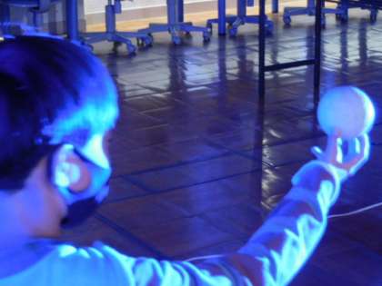 理科です。コンピュータ室にプロジェクターを利用したシュミレーション装置を使って月の満ち欠けを疑似体験しています。プロジェクターの光を太陽光に、手に持ったボールを月に見立て、回転することで月の満ち欠けを再現しています。