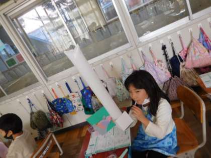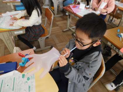 12/20(月) 1年生 公開日 2021/12/20 更新日 2021/12/20 1年生 図工です。「にょきにょきとびだせ」の製作です。空気を吹き込んだ長いビニル袋や手袋が箱から飛び出す仕組みを使って、表現します。どんなものに変身するか楽しみですね。