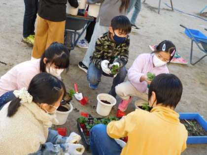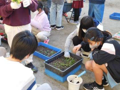 12/21(火) 5年生 公開日 2021/12/21 更新日 2021/12/21 5年生 総合的な学習です。卒業式、入学式に会場を彩る花をこれから育てていきます。今日は、土作りと苗の植え替えです。心を込めて育ててあげてくださいね。