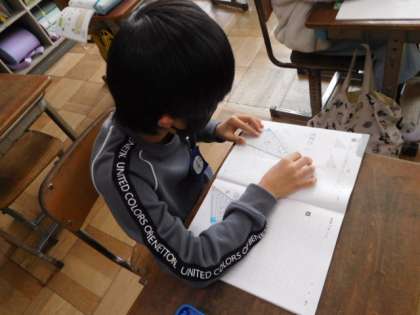12/22(水) 3年生 公開日 2021/12/22 更新日 2021/12/22 3年生 算数です。「三角形」の学習です。三角定規の画の大きさを比べています。画の大きさが等しいのが、どことどこの角か、一番小さい角はどこか調べています。