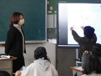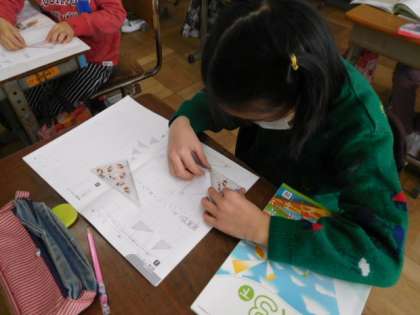 12/22(水) 3年生 公開日 2021/12/22 更新日 2021/12/22 3年生 算数です。「三角形」の学習です。三角定規の画の大きさを比べています。画の大きさが等しいのが、どことどこの角か、一番小さい角はどこか調べています。