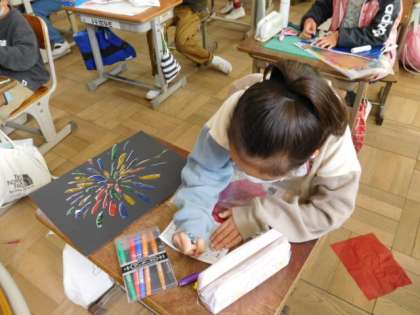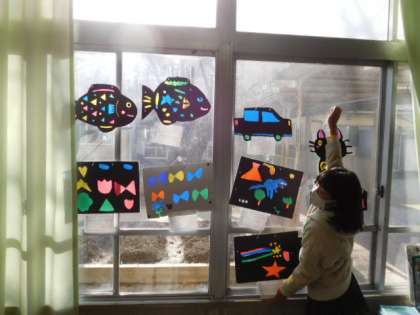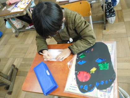 12/22(水) 2年生 公開日 2021/12/22 更新日 2021/12/22 2年生 図工です。「ひかりのプレゼント」が次々とできあがってきます。完成した作品が窓にかざられていきます。セロハンに光が通って色とりどりのきれいな模様を描いています。