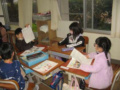 1年生の生活科の授業。「いえのしごとにチャレンジ」と題して、「どんなことにチャレンジしたか」「チャレンジしてわかったこと」をグループで発表しています。冬休み、どんなチャレンジがあったかな?