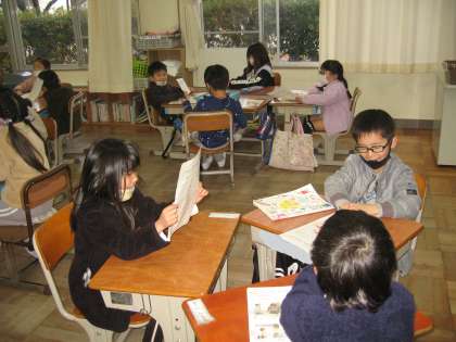 1年生の生活科の授業。「いえのしごとにチャレンジ」と題して、「どんなことにチャレンジしたか」「チャレンジしてわかったこと」をグループで発表しています。冬休み、どんなチャレンジがあったかな?
