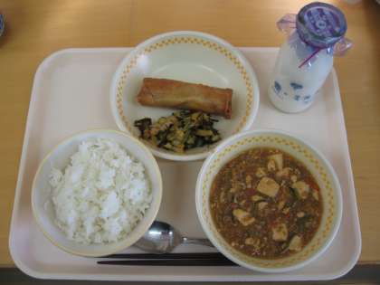 今日の献立は ごはん・ぎゅうにゅう はるまき マーボどうふ はくさいのこんぶあえ です。