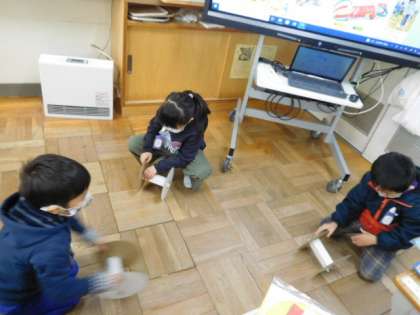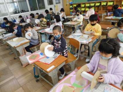 1/12(水) 1年生 公開日 2022/01/12 更新日 2022/01/12 1年生 図工です。「かみざらコロコロ」の製作が始まりました。紙皿を芯の両側に貼り糸巻きのようにして転がるようにします。芯の位置を変えると変わった転がり方をします。試しに転がしながら、どんな飾りを付けるか考えています。
