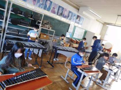 音楽です。「汽車は走る」の演奏の練習をしています。汽車の走る様子を音楽で表すことがめあてです。木琴、鉄琴、ピアニカに分かれて汽車の走る様子をみんなで表現します。