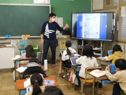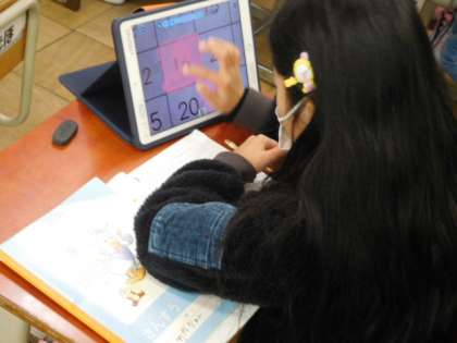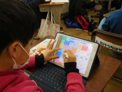 算数です。「九九のきまり」の学習です。九九の表を見て、九九の答えがどのようにならんでいるか調べます。今日は同じ答えになる九九がいくつあるか、タブレット端末に配付された九九の表に色を付けて確かめています。