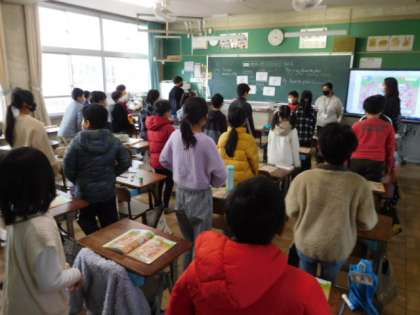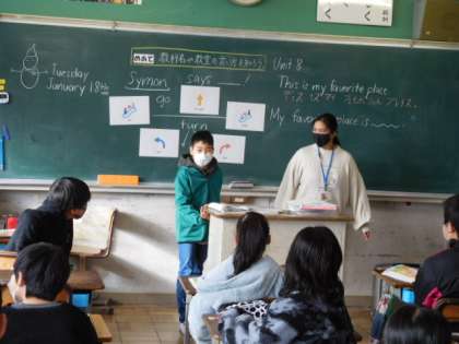 1/18(火) 4年生 公開日 2022/01/18 更新日 2022/01/18 4年生 外国語活動です。「This is my favorite place./My favorite place is 〜.」の練習です。教科や教室、特別教室の名前の言い方も覚えながらフレーズを繰り返し練習します。