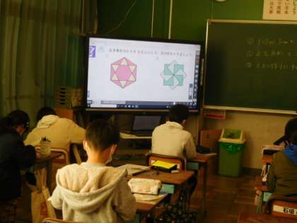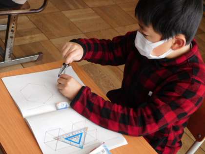 1/18(火) 5年生 公開日 2022/01/18 更新日 2022/01/18 5年生 算数です。「円と正多角形」の学習です。コンパスと分度器、定規で正多角形を描きます。その描き方をもとにしていろいろな模様を描いていきます。