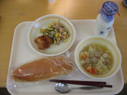 1/18(火) 給食 公開日 2022/01/18 更新日 2022/01/18 給食 今日の献立は ミルクロールパン・ぎゅうにゅう とりにくのバーベキューソースかけ ふゆやさいのポトフ だいコーンサラダ (たくじょうイタリアンドレッシング) です。
