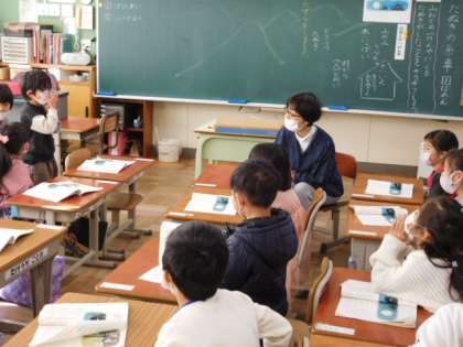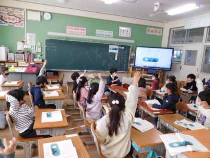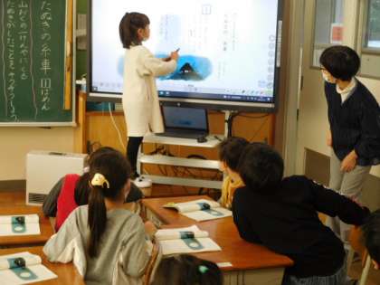 国語です。「たぬきの糸車」の学習です。山奥の一けんやにくるたぬきがしたことを想像します。文章に書いてあることから場面を想像します。言葉からイメージをふくらます大事な時間です。