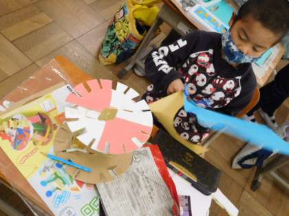 1/19(水) 1年生 公開日 2022/01/19 更新日 2022/01/19 1年生 図工です。「かみざらコロコロ」の制作です。紙皿で作った車輪に、飾り付けをしています。コロコロ転がりながら付けた飾りがどんな模様を描くか楽しみです。