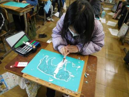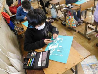 1/19(水) 4年生 公開日 2022/01/19 更新日 2022/01/19 4年生 図工です。版画の制作をしています。下描きが終わり、下描きに沿って彫り始めたところです。真剣な目は、職人そのものです。
