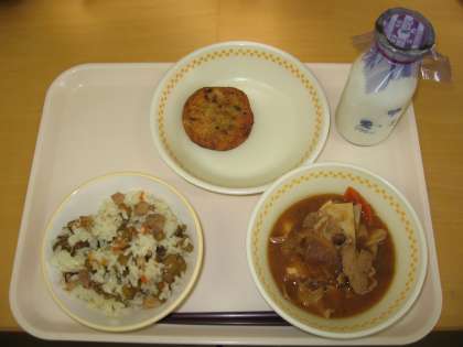 今日の献立は ごはん・ぎゅうにゅう ふきごきんのぐ いかねぎやき あいちけんさんやさいいりぶたじる です。