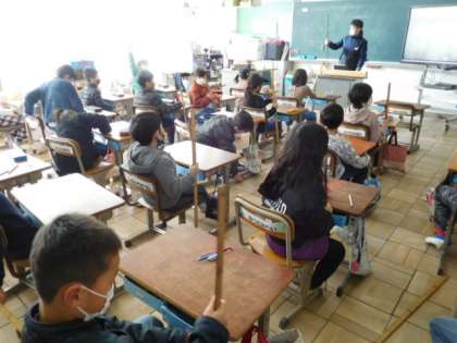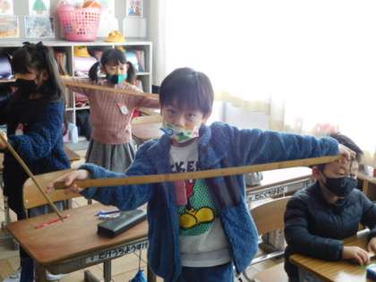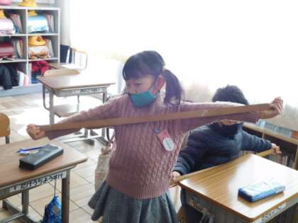 1/21(金) 2年生 公開日 2022/01/21 更新日 2022/01/21 2年生 算数です。「長さ」の学習です。身長と手を広げた長さが同じになるのかという先生からの問いかけに、1mものさしを使って確かめています。実体験をしながら、長さの概念を身につけていきます。