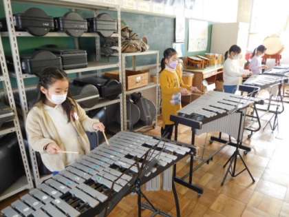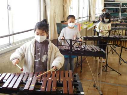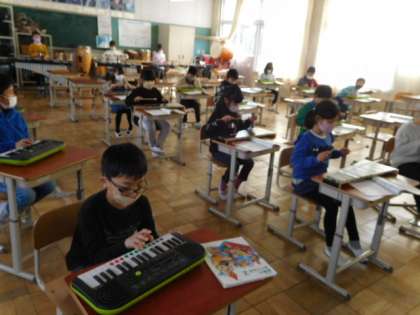 音楽です。「汽車は走る」の練習です。「汽車の走る様子を音楽で表そう」がめあてです。いろいろな楽器を使って、汽車が走っている様子が思い浮かぶ演奏ができるように練習中です。