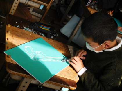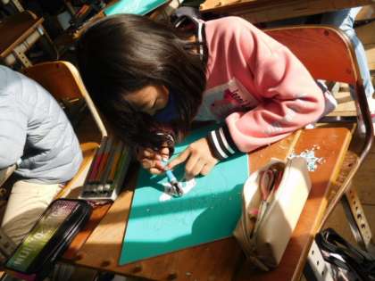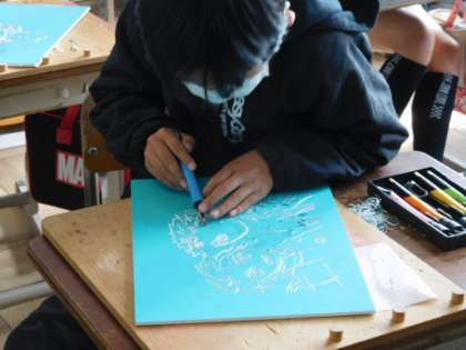 図工です。版画の制作の続きをしています。彫刻刀の使い方にも慣れてきて、思い通りに彫ることができるようにおなった子が増えたようです。みんな夢中になって彫っています。