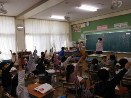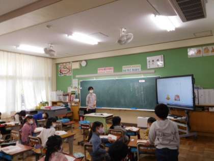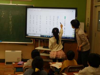 国語です。「ことばを見つけよう」の学習です。「かばんの中にはかばがいる。はちまきの中には何がいるでしょう」言葉遊びをしながら語彙力を身につけていきます。