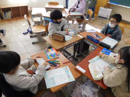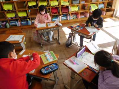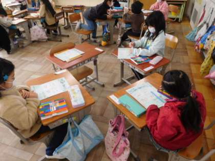 生活科です。来年度1年生になる子どもたちへお手紙を書いています。1年生が不安にならないように、小学校での楽しい生活の様子を教えてあげます。すっかり、お兄さんお姉さんになりました。