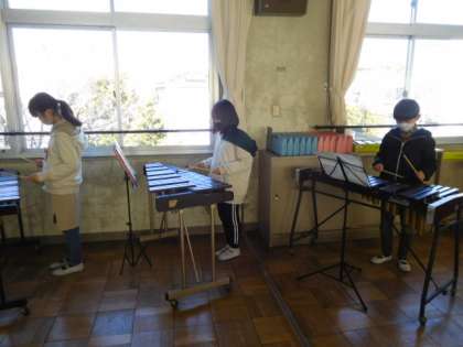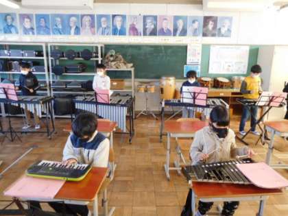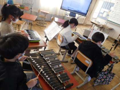 音楽です。「ラ クンパルシータ」の練習です。キーボード、木琴、鉄琴に分かれ、パート練習をしています。だんだん楽譜通り弾けるようになってきました。みんなとアンサンブルするのが楽しみですね。