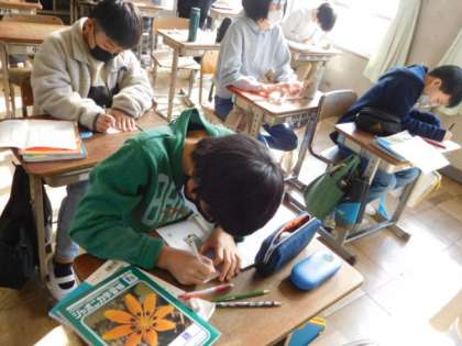 国語です。「伝わる表現を選ぼう」の学習です。伝えたいことが伝わるためには、相手に応じた言葉を選ぶ必要があります。ペア学年にお手紙を書いて、自分の伝えたいことを表現します。