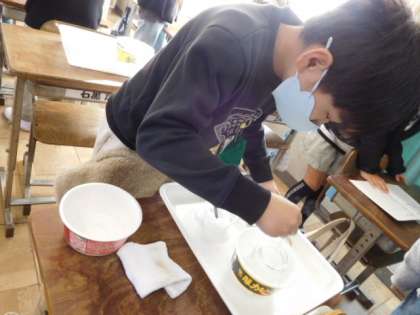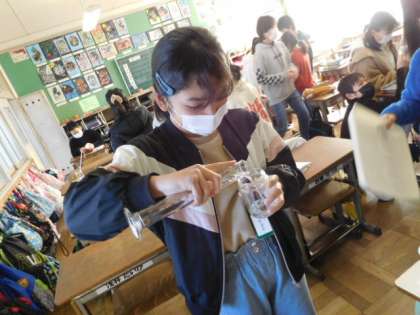 2/1(火) 5年生 公開日 2022/02/01 更新日 2022/02/01 5年生 理科です。ミョウバンをもっと水に溶かすにはどうしたらよいか実験で確かめます。水の量を変えたり、水の温度を変えたりして試しています。どんな結果が出るか楽しみですね。
