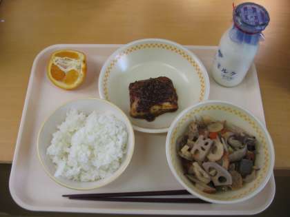 今日の献立は ごはん・ぎゅうにゅう けんちんしのだのにくみそかけ ちくぜんに いよかん です。