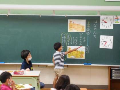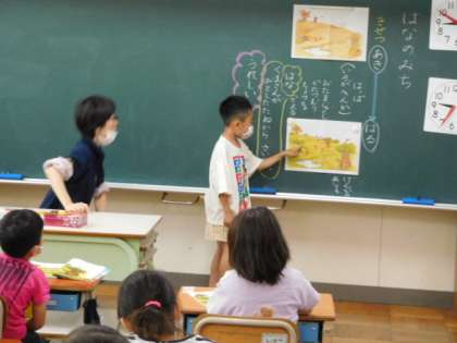 5/25(水) 1年生 公開日 2022/05/25 更新日 2022/05/25 1年生 国語です。「はなのみち」の学習です。挿絵を見て、秋から春になったらどんな変化があったのか発表し合っています。見つけたことを上手に説明できていますね。