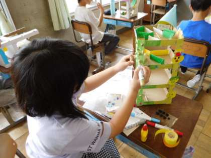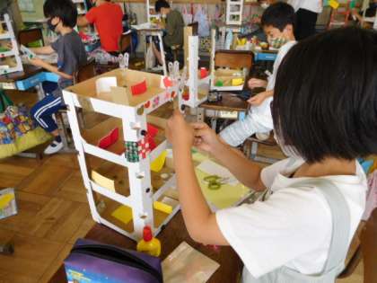 5/26(木) 4年生 公開日 2022/05/26 更新日 2022/05/26 4年生 図工です。「コロコロガーレ」の製作です。ビー玉が転がる仕組みを作って楽しく遊べるおもちゃを作っています。ビー玉がどんなふうに転がっていくか考えるのは楽しそうですね。