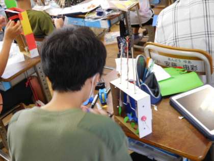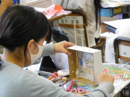 図工です。「くるくるクランク」の製作です。製作が進んで、クランクの動きに合わせたアイデアあふれる作品ができあがってきました。