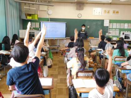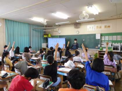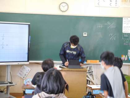 算数です。2.5×8×1/2のように分数・少数・整数の混じったかけ算の練習です。これまで身に付けた計算方法を駆使していっしょうけんめい解いています。